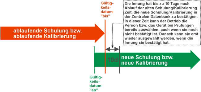 Die Innung hat bis zu 10 Tage nach Ablauf der bestätigten alten Schulung /Kalibrierung Zeit, die neue in der Zentralen Datenbank zu bestätigen. In dieser Zeit wird die Schulung bzw. Kalibrierung akzeptiert, auch wenn diese Daten noch nicht bestätigt sind.