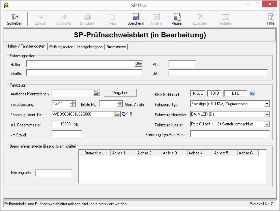 Starten Sie bitte SP Plus und wählen Sie die Schaltfläche ‘SP-Daten‘. Legen Sie dort mit der Schaltfläche ‚Neu‘ eine neue Prüfung an und geben Sie die exemplarischen Daten ein: